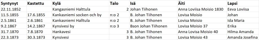 Heikin perheeseen kuuluivat vmo Hilma Lampinen, Kiimmäessä syntyneet lapset Otto ja vmo Anna, Tilda avioitui 1919 Hytösen kanssa, Hannes, Lyyli avioitui Virtasen kanssa, Oskar, Niilo, Jalmari, Vilho. Martti kuoli 1917 ja Rauha. Bertta syntyi Moisiossa samoihin aikoihin kuin Oton ja Annan esikoinen v. 1918. Kymistä Moisioon muutti myös Hilma Lampisen sisko Katri tyttäsensä Tyyne Kuparisen kanssa. Tyyne avioitui Väinö Oksasen kanssa.